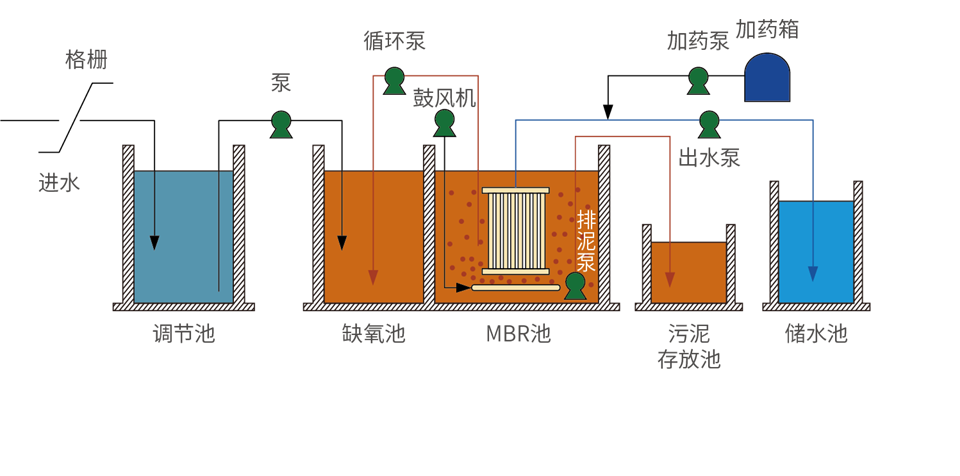 MBR工藝是一種將高效膜分離技術(shù)與傳統活性污泥法相結合的新型高效污水處理工藝,它將具有獨特結構的MBR膜組件置于曝氣池中,經(jīng)過(guò)好氧曝氣和生物處理后的污水,由泵通過(guò)濾膜過(guò)濾后抽出。它利用膜分離設備將生化反應池中的活性污泥和大分子有機物質(zhì)截留住,省掉二沉池?;钚晕勰酀舛纫虼舜蟠筇岣?,水力停留時(shí)間(HRT)和污泥停留時(shí)間(SRT)可以分開(kāi)控制,使難降解的物質(zhì)回流至反應器中不斷反應、降解。由于MBR膜大大提高了系統固液分離的能力,從而使系統出水水質(zhì)和容積負荷都得到大幅度提高,經(jīng)膜處理后的出水水質(zhì)優(yōu)于國家一級A標準,經(jīng)消毒后可直接作為新生水源。