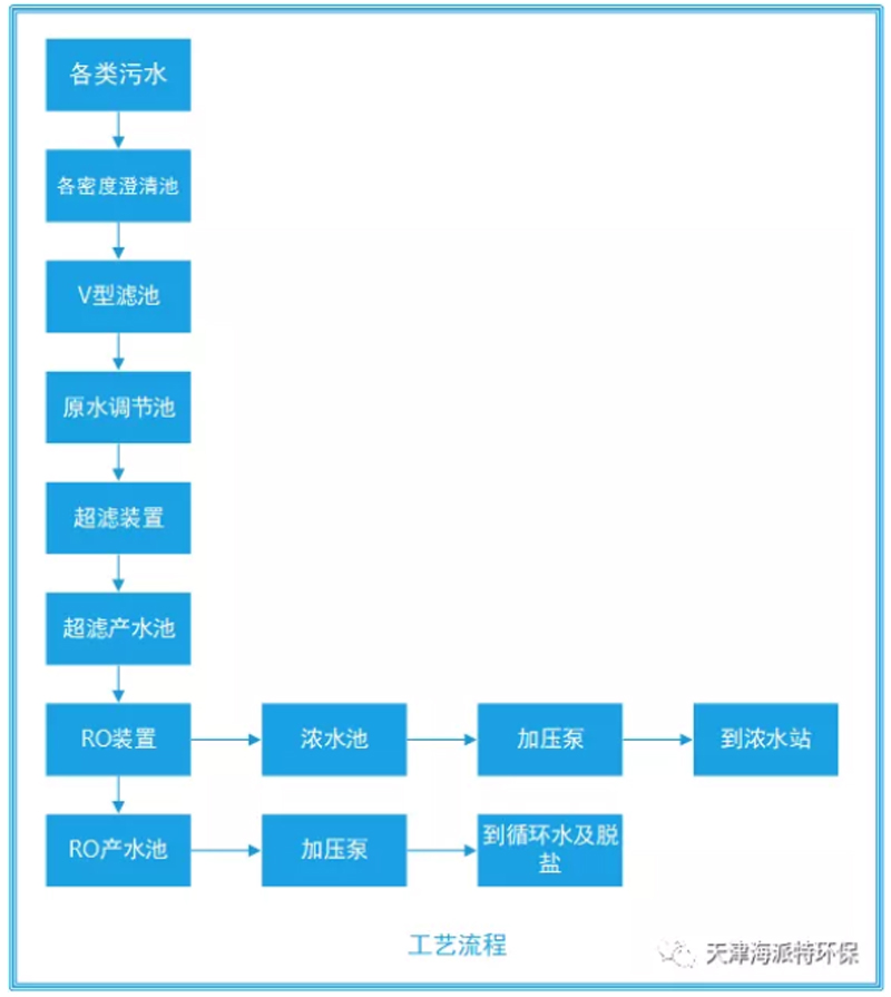 該項目處理水量是12500T/D,出水標準為中水回用水質(zhì)標準。整個(gè)項目采用以下工藝,天津海派特主要負責中水回用裝置界區超濾工藝設備、管道、電氣、儀控等工程設計、制造、供貨、安裝、調試工作。